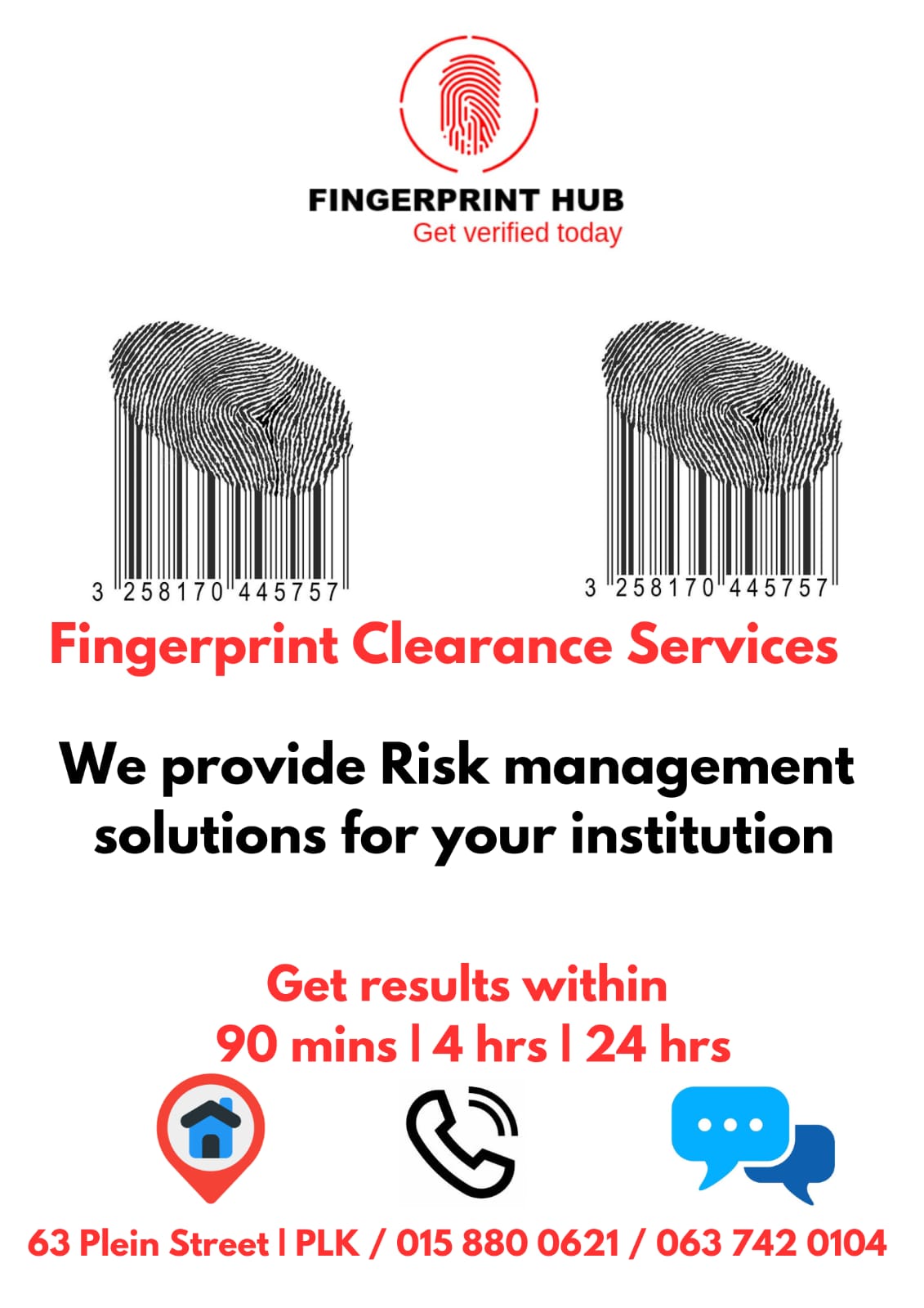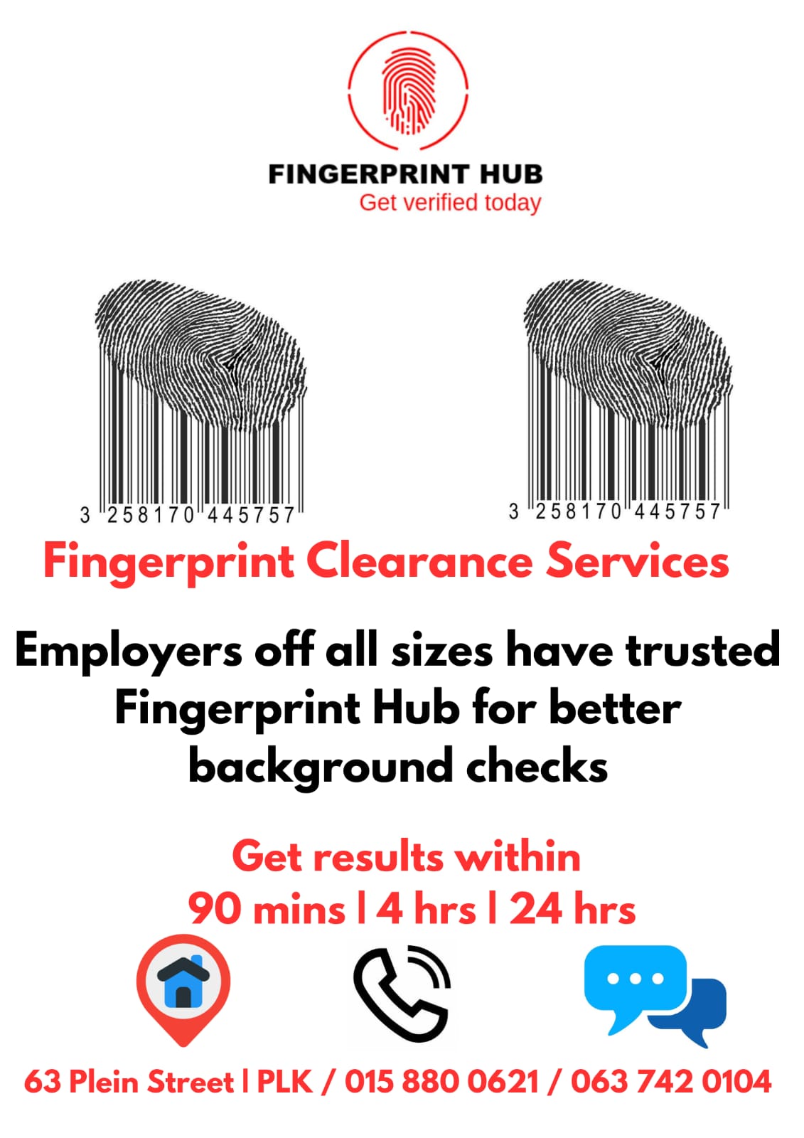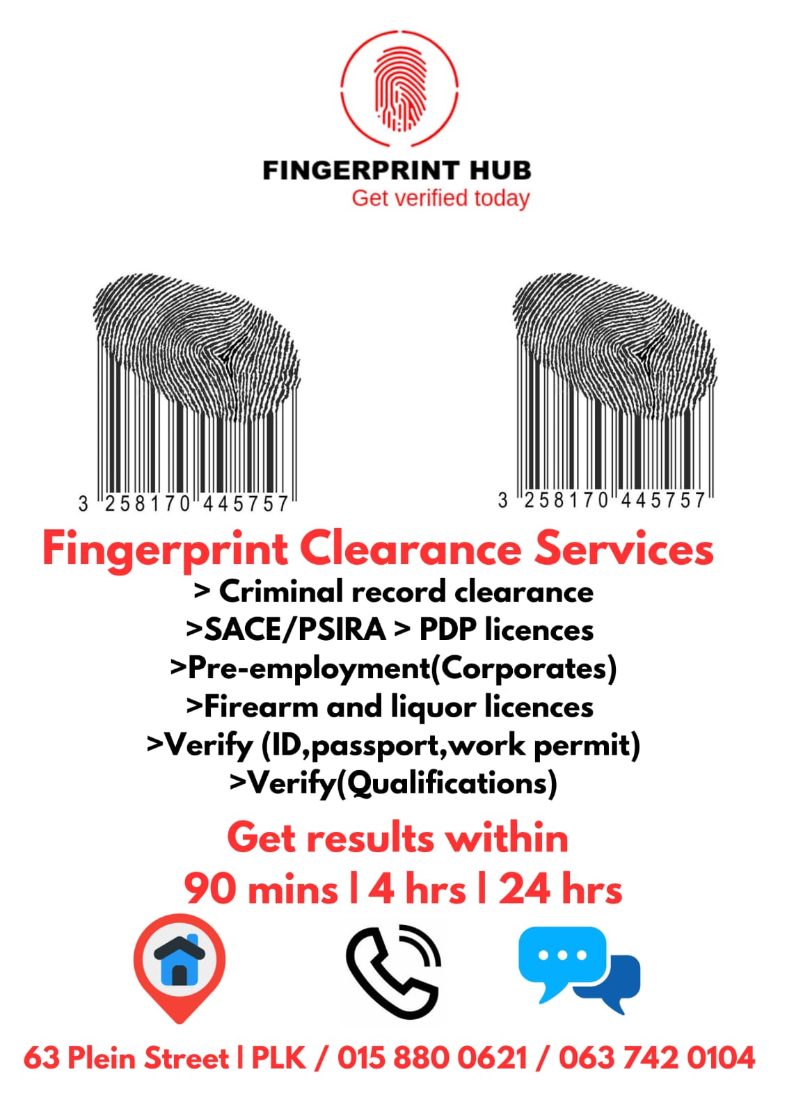 Book An Appointment: Name: Surname: Date Of Service: Contact Number: Your email Service Required: ● Criminal Record Clearance● SACE/PSIRA● Pdp licences● Pre-employment● Verify (ID, Passport)● Verify (Academic qualifications) Urgency: ● Within 90 minutes● Within 4 hours● Within 24 hours● Within 48 hours Any Other Service Request Or Description: (optional) Visitors Today 13 Visitors Today Live Visitors 7 Live visitors Total Visitors 25376 Total Visitors